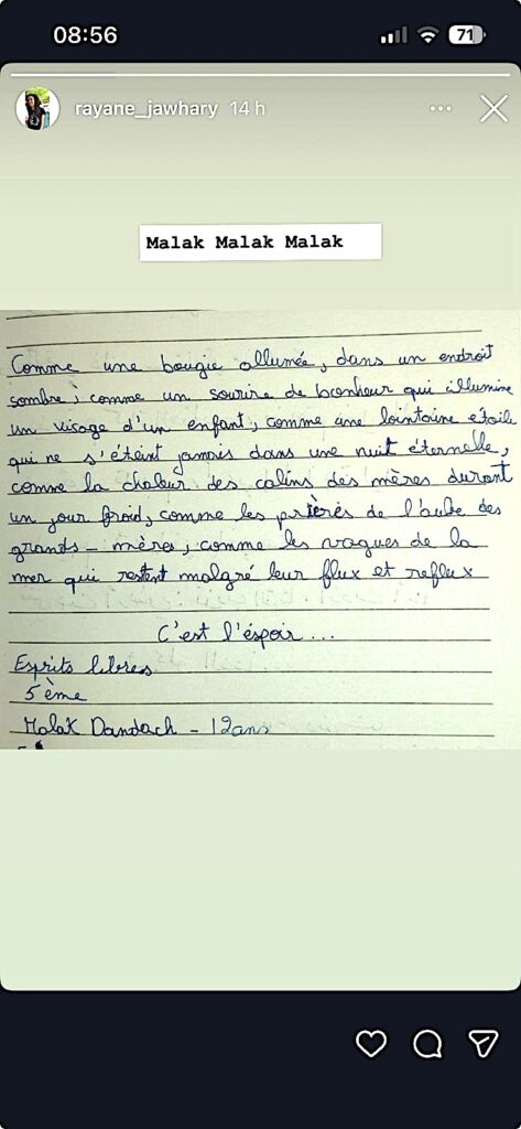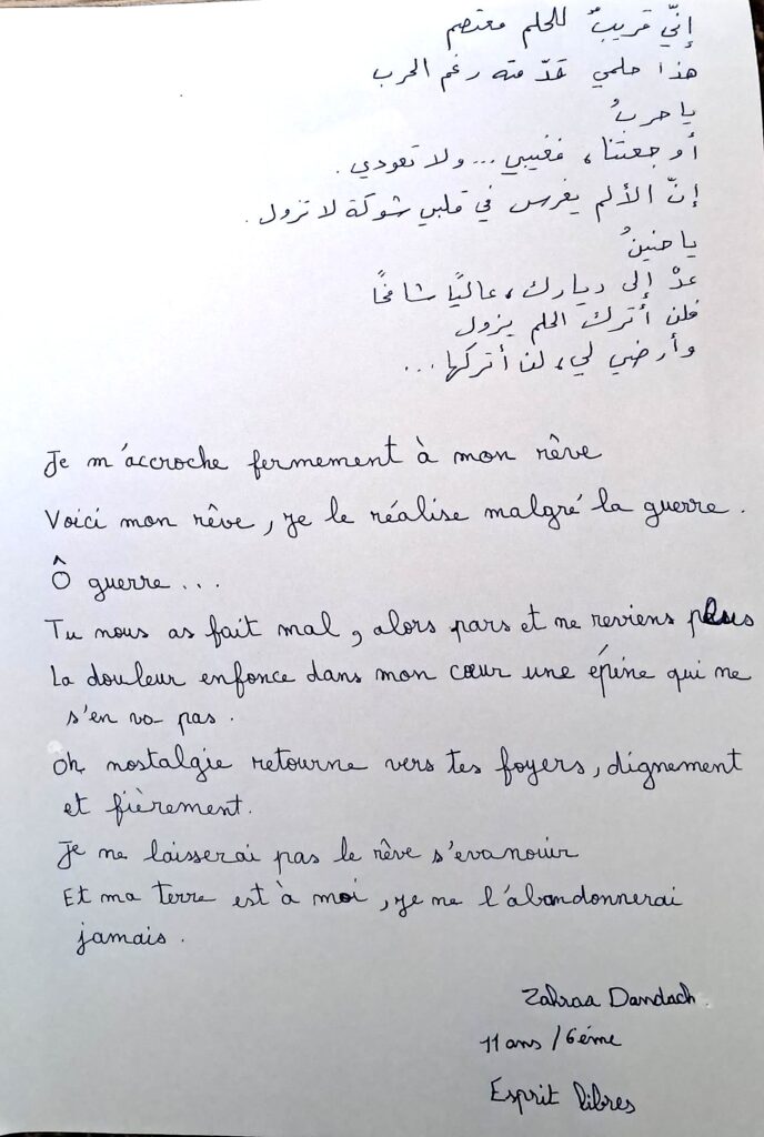 Suite aux derniers évènements internationaux et au bombardements massifs du Liban, la situation à Hermel est catastrophique. Une partie importante de la population a fui la ville. L’école est provisoirement fermée mais les enseignants ont mis en place des aides psychologiques et un soutien scolaire en ligne via wattsap. L’Ecole Esprits Libres a été mise a l’honneur lors de la représentation « Radio Live » qui a eu lieu le 20 juillet dans le in du Festival d’Avignon