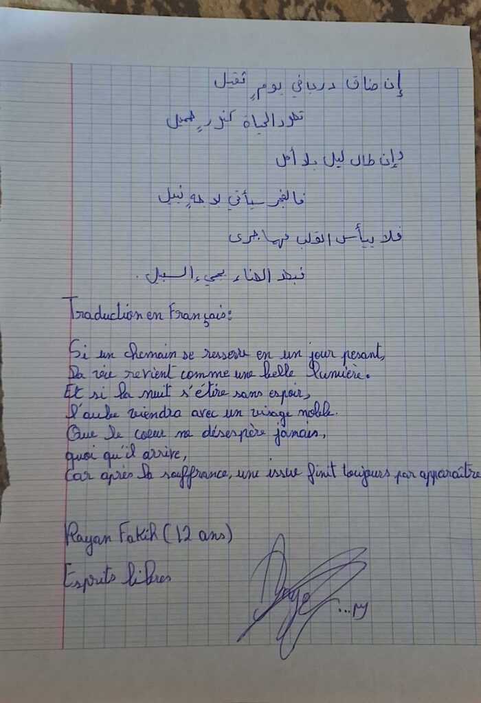 L’école Esprits Libres met en œuvre les méthodes pédagogiques prônées par l’éducation nouvelle. Créée en 2019 à l’initiative d’enseignantes et d’acteurs socio-éducatifs à Hermel au Liban, et avec le soutien du COBIAC, cet établissement scolaire (de la maternelle au collège) vise le développement des compétences cognitives, émotionnelles, affectives et sociales des apprenants, dans un esprit de bienveillance et d’adaptation aux besoins individuels.